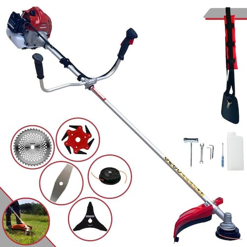 Com guidão ergonômico lateral, permite um alcance amplo e maior mobilidade, capaz de aumentar a produtividade diária. Possui motor 2 tempos á gasolina, de 52 Cilindradas; 2,5HP de potência que proporcionam maior performance e economia na operação. Seu conjunto de acessórios inclui kit de ferramentas, cinto de suporte almofadado, carretel de nylon e lâmina de corte 3 pontas.