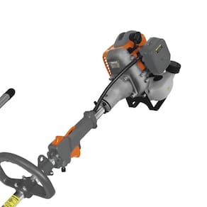 Roçadeira multifuncional, gasolina, potência, alça D, design ergonômico, troca rápida de acessórios, grama, cercas vivas, poda de galhos, jardins, áreas externas.