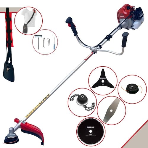 Com guidão ergonômico lateral, permite um alcance amplo e maior mobilidade, capaz de aumentar a produtividade diária. Possui motor 2 tempos á gasolina, de 43 Cilindradas; 1,7HP de potência que proporcionam maior performance e economia na operação. Seu conjunto de acessórios inclui kit de ferramentas, cinto de suporte almofadado, carretel de nylon e lâmina de corte 3 pontas.
