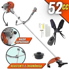 Com guidão ergonômico lateral, permite um alcance amplo e maior mobilidade, capaz de aumentar a produtividade diária. Possui motor 2 tempos á gasolina, de 51,6 Cilindradas (52cc) 13.000 de rotação 2,0 de potência que proporcionam maior performance e economia na operação. Seu conjunto de acessórios inclui kit de ferramentas, cinto de suporte duplo almofadado, carretel de nylon e lâmina de corte 3 pontas.