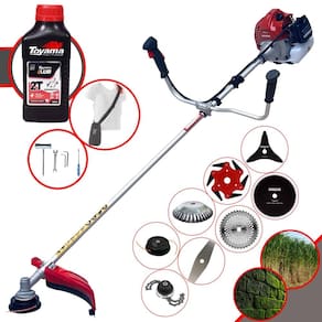 Roçadeira À Gasolina Kawashima BCJ 431L 42,7CC 1,7HP 2T + Faca 3 Pontas + Faca 6 Pontas + Faca 40 Dentes + Faca 80 Dentes + Trimmer + Escova 38 Cerdas + Óleo Toyama FG50 500ml