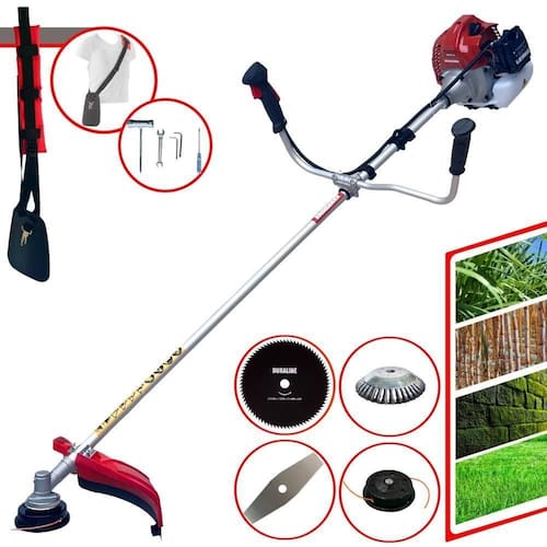 Com guidão ergonômico lateral, permite um alcance amplo e maior mobilidade, capaz de aumentar a produtividade diária. Possui motor 2 tempos á gasolina, de 43 Cilindradas; 1,7HP de potência que proporcionam maior performance e economia na operação. Seu conjunto de acessórios inclui kit de ferramentas, cinto de suporte almofadado, carretel de nylon e lâmina de corte 3 pontas.