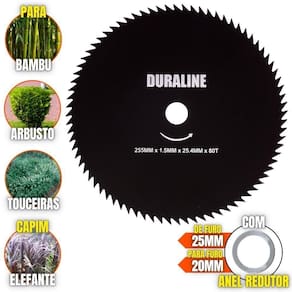 O DISCO DE CORTE 80 Dentes acompanha um anel de redução que pode ser utiizada para roçadeiras de furo 20mm ou 25mm, sendo feita em aço cromo vanádio que garante mais segurança, desempenho e durabilidade. É uma lâmina balanceada, fazendo com que haja menor vibração, corte contínuo e suave, com mais conforto ao operador e mais longevidade para a roçadeira. Possui maior rendimento no trabalho e não precisa ser afiada antes do uso. É um disco multiuso pois pode ser aplicado para diferentes trabalhos, tendo em vista que pode serrar madeiras até 10cm, dentre elas esse modelo corta: Arbustos, Pequenas Árvores, Capim Grosso, Capim Elefante, Capim Guanxuma, Capim Annoni, Vassourinha, Bambu, Cana de Açúcar , Mato Alto, Capim Napier, Capim Sapê, Touceiras entre outros.