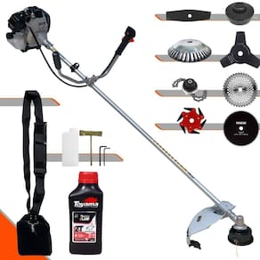 Roçadeira Profissional À Gasolina Toyama TBC43H 42,7cc 1,7HP 12.000rpm 2T + Faca 2 Pontas 330mm + Faca 40 Dentes 255mm + Faca 80 Dentes 255mm + Faca 6 Pontas 250mm + Trimmer + Escova Rotativa 200mm 38 Cerdas + Óleo Toyama FG50 500ml