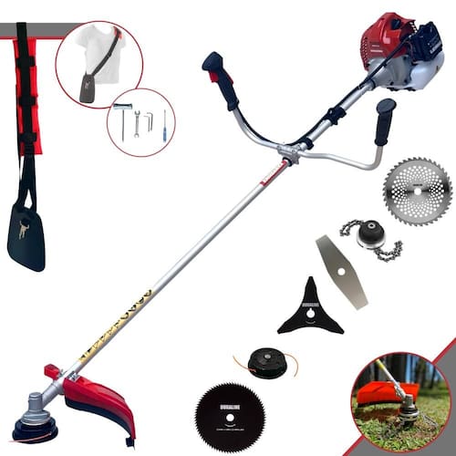 Com guidão ergonômico lateral, permite um alcance amplo e maior mobilidade, capaz de aumentar a produtividade diária. Possui motor 2 tempos á gasolina, de 52 Cilindradas; 2,5HP de potência que proporcionam maior performance e economia na operação. Seu conjunto de acessórios inclui kit de ferramentas, cinto de suporte almofadado, carretel de nylon e lâmina de corte 3 pontas.