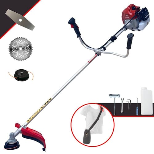 Com guidão ergonômico lateral, permite um alcance amplo e maior mobilidade, capaz de aumentar a produtividade diária. Possui motor 2 tempos á gasolina, de 43 Cilindradas; 1,7HP de potência que proporcionam maior performance e economia na operação. Seu conjunto de acessórios inclui kit de ferramentas, cinto de suporte almofadado, carretel de nylon e lâmina de corte 3 pontas.