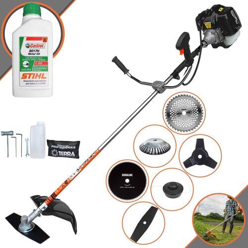 Roçadeira Lateral Terra GRH-520 Black À Gasolina2 Tempos 52cc 2,5HP +Faca 3 Pontas 255mm 2,9mm + Faca 40 Pontas 255mm 2mm + Faca 80 Pontas 255mm 1,5mm+Escova Rotativa 200mm 38 Cerdas + Óleo Castrol Stihl 500ml