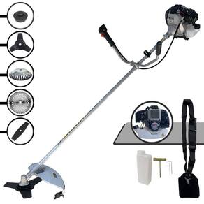 Com guidão ergonômico lateral, permite um alcance amplo e maior mobilidade, capaz de aumentar a produtividade diária. Possui motor 2 tempos á gasolina, de 42,7 Cilindradas, 12.000 de rotação 1,7HP de potência que proporcionam maior performance e economia na operação. Seu conjunto de acessórios inclui kit de ferramentas, cinto de suporte almofadado, carretel de nylon e lâmina de corte 3 pontas.