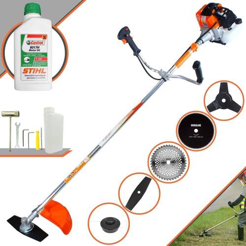 Roçadeira Lateral Vulcan VR430S À Gasolina 2 Tempos 43cc 1,7HP + Faca 3 Pontas 255mm 2,9mm + Faca 40 Dentes 255mm 2mm + Faca 80 Dentes 255mm 2mm + Óleo CASTROL STIHL 500ml