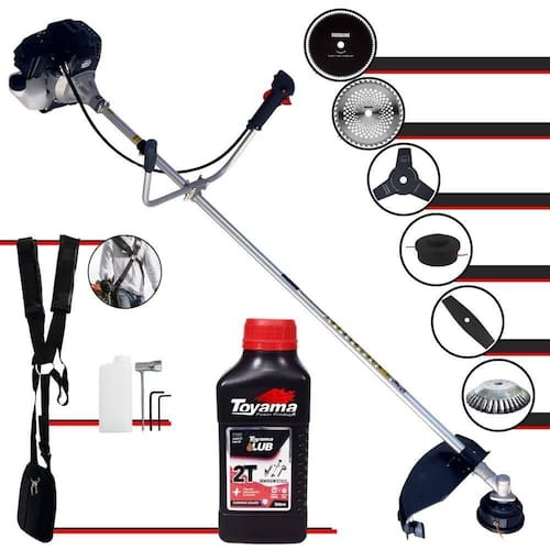 Roçadeira Profissional À Gasolina Toyama RT43L-B-25A 43cc 1,7HP 2T Com Lâmina 3 Pontas + Faca 2 Pontas 330mm + Faca 40 Dentes 255mm + Faca 80 Dentes 255mm + Escova Rotativa 38 Cerdas + Óleo Toyama FG50 500ml