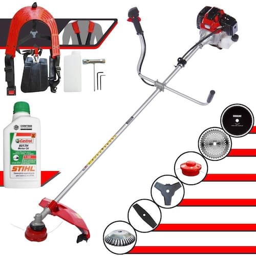 Roçadeira Profissional À Gasolina Toyama RT52L 52cc 2HP 2T Com Lâmina 3 Pontas + Faca 2 Pontas 330mm + Faca 40 Dentes 255mm + Faca 80 Dentes 255mm + Escova Rotativa 38 Cerdas + Óleo Castrol Stihl 500ml