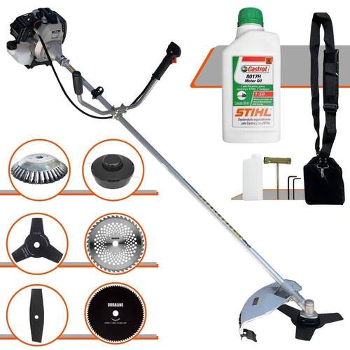 Roçadeira Profissional À Gasolina Toyama TBC43H 42,7cc 1,7HP 12.000rpm 2T + Faca 2 Pontas 330mm 2,7mm + Faca 40 Dentes 255mm 2mm + Faca 80 Dentes 255mm 1,5mm + Escova Rotativa 38 Cerdas 200mm + Óleo Castrol Stihl 500ml