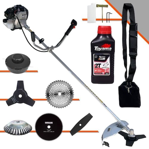 Roçadeira Profissional À Gasolina Toyama TBC43H 42,7cc 1,7HP 12.000rpm 2T + Faca 2 Pontas 330mm 2,7mm + Faca 40 Dentes 255mm 2mm + Faca 80 Dentes 255mm 1,5mm + Escova Rotativa 38 Cerdas 200mm + Óleo Toyama FG50 500ml