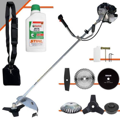 Com guidão ergonômico lateral, permite um alcance amplo e maior mobilidade, capaz de aumentar a produtividade diária. Possui motor 2 tempos á gasolina, de 42,7 Cilindradas, 12.000 de rotação 1,7HP de potência que proporcionam maior performance e economia na operação. Seu conjunto de acessórios inclui kit de ferramentas, cinto de suporte almofadado, carretel de nylon e lâmina de corte 3 pontas.