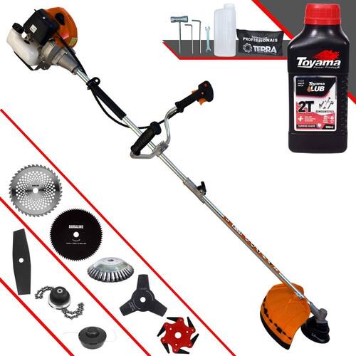 Roçadeira Terra GRHB-430 Bipartida À Gasolina 2 Tempos 43cc 1,7HP + Faca 3 Pontas + Faca 40 Pontas + Faca 80 Pontas + Faca 6 Pontas + Escova 38C + Trimmer + ÓLEO TOYAMA LUB FG50 500ml 2T