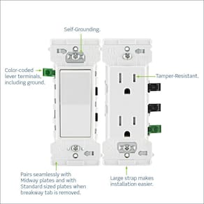 - Mais fácil – A alça grande facilita as instalações, bem como a capacidade de usar fio de cobre sólido e trançado de calibre 14 e 12