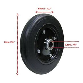 Especificações Técnicas: Modelo: CP10R Material da Roda: Chapa Estampada Reforçada Revestimento: Pneu de Borracha Maciça Altamente Resistente Diâmetro Total: 250mm 10 polegadas Largura do Pneu: 38mm 1.1/2 polegadas Comprimento do Cubo: 55mm Tipo de Mancal: Rolamento de Roletes de Alta Performance Diâmetro para Eixo: 7/8 polegadas Compatível com a maioria dos eixos Capacidade de Carga: 130 Kg por roda