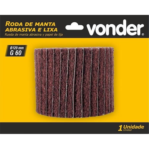 Marca: VonderConteúdo da embalagem: 1 Roda de manta abrasiva e lixa.Destaques e diferenciais:Utilizadas também na remoção de riscos leves e no recondicionamento de superfícies, produzindo um acabamento acetinado em uma só etapa.Dicas de uso:Ideal para remoção e acabamento de superfícies metálicas diversas, principalmente aço inox. Indicada para uso na Politriz Escovadeira PEV 1380 VONDER.Detalhes Técnicos:Diâmetro externo da roda abrasiva: 120,0 mm Largura da roda abrasiva: 100,0 mm Diâmetro do furo da roda de lixa: 19,0 mm Tipo de grão abrasivo: Carbeto de silício Grão: G 60 Rotação máxima: 3.800/min