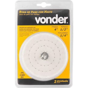 A Roda De Pano 4 C/Haste Vonder 3599044000 é perfeita para realizar polimentos com bastões em furadeiras. Com sua haste metálica, ela se fixa facilmente na furadeira, proporcionando maior praticidade durante o uso.