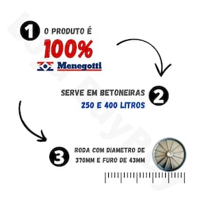 BUY BUY Leia atentamente a descrio antes de comprar o produto - Produto de alta qualidade e durabilidade. - Aconselha-se um profissional para manuteno do seu equipamento.. ============================= Item: Roda Plstica para betoneiras 250 / 400 Litros Caractersticas: Quantidade: 1 pea Origem: Menegotti Produo: Nacional Material: Plstico Furo: 43mm Dimetro: 370mm Cdigo Fabricante: 24110197 ============================ A Os produtos so novos R: Todos os produtos da so novos com do seu fabricante. D Como so realizadas as entregas R: Sim, desde que more perto de nossa loja fsica, localizada em So Paulo Capital. F Os produtos possuem R: Todos produtos possuem direto com o seu fabricante de no mnimo 3 meses de acordo com a lei. Esse prazo estar no anncio. G -aceitamos troca de dados de faturamento aps compra R: Confira o seu endereo de entrega cadastrado, pois no aceitamos alteraes do mesmo aps a compra.