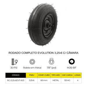 O conjunto é fornecido pronto para uso, composto por pneu 3.25-6, câmara de ar e rolete metálico, garantindo praticidade na substituição e excelente desempenho no transporte manual de cargas. O rolete metálico proporciona maior resistência estrutural, estabilidade e durabilidade, sendo ideal para uso intenso e contínuo.