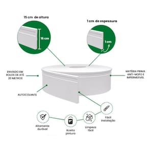 Rodapé eva autocolante 15cm rp16 6 metros meurodapé Solução prática, economica e inovadora para deixar seu ambiente mais bonito, sofistidado e moderno, produzido em borracha e.V.A, material de alta durabilidade, flexivel, ecologico, não apodrece, não pega cupim,pode ser molhado e aceita qualquer tipo de pintura . Podendo ser instaldo como: rodapés, roda tetos, roda meios, boiseries, faixas, molduras ou como sua imaginação quiser Ahhh... Se você gosta do faça você mesmo, vai adorar, pois é de facil instalação, já vem com fita dupla face, sem sujeira, não necessita cantoneiras e pode ser instalado em áreas internas e externas Características gerais do produto: Dimensões axlxp cm : 15 x 1 x 600 Produzido em: borracha e.V.A Cor acabamento: branco fosco : 3 anos junto ao fabricante Aplicação: externo ou interno Acompanha o produto: 6 metros de rodapé : 3 anos junto ao fabricante Marca: Não Informado