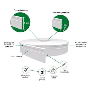 Rodapé eva autocolante 7cm rp16 9 metros meurodapé Solução prática, economica e inovadora para deixar seu ambiente mais bonito, sofistidado e moderno, produzido em borracha e.V.A, material de alta durabilidade, flexivel, ecologico, não apodrece, não pega cupim,pode ser molhado e aceita qualquer tipo de pintura . Podendo ser instaldo como: rodapés, roda tetos, roda meios, boiseries, faixas, molduras ou como sua imaginação quiser Ahhh... Se você gosta do faça você mesmo, vai adorar, pois é de facil instalação, já vem com fita dupla face, sem sujeira, não necessita cantoneiras e pode ser instalado em áreas internas e externas Características gerais do produto: Dimensões axlxp cm : 7 x 1 x 900 Produzido em: borracha e.V.A Cor acabamento: branco fosco : 3 anos junto ao fabricante Aplicação: externo ou interno Acompanha o produto: 9 metros de rodapé : 3 anos junto ao fabricante Marca: Meurodapé