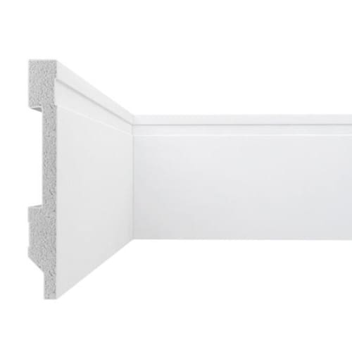Rodapé em poliestireno floort® . Rodapé de acabamento para ambientes internos. Material imune a pragas, cupins e resistentes à água, não mofam, não apodrecem e não propagam bactérias. Instalação sem restrição com relação ao tipo de piso a ser instalado. Rodapé em régua que pode ser instalado em espaços residenciais e comerciais incluindo ambientes úmidos.