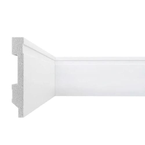 Rodapé em poliestireno floort® . Rodapé de acabamento para ambientes internos. Material imune a pragas, cupins e resistentes à água, não mofam, não apodrecem e não propagam bactérias. Instalação sem restrição com relação ao tipo de piso a ser instalado. Rodapé em régua que pode ser instalado em espaços residenciais e comerciais incluindo ambientes úmidos.