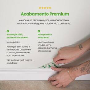 Características Adicionais do Produto: Autocolante Resistente a água e imune a cupins Produzido em EVA Borracha Sintética de alta resistência Flexível e se adapta em qualquer tipo de parede, incluindo as com curvas O Fácil de limpar, basta um pano úmido, sem necessidade de produtos específicos Combina com qualquer tipo de piso e parede