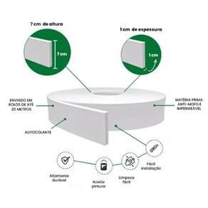 Rodapé ripado eva autocolante 7cm rp43 7 metros meurodapé Solução prática, economica e inovadora para deixar seu ambiente mais bonito, sofistidado e moderno, produzido em borracha e.V.A, material de alta durabilidade, flexivel, ecologico, não apodrece, não pega cupim,pode ser molhado e aceita qualquer tipo de pintura . Podendo ser instaldo como: rodapés, roda tetos, roda meios, boiseries, faixas, molduras ou como sua imaginação quiserAhhh... Se você gosta do faça você mesmo, vai adorar, pois é de facil instalação, já vem com fita dupla face, sem sujeira, não necessita cantoneiras e pode ser instalado em áreas internas e externasCaracterísticas gerais do produto: Dimensões axlxp (cm): 7 x 1 x 700 Produzido em: borracha e.V.A Cor acabamento: branco fosco Garantia: 3 anos junto ao fabricante Aplicação: externo ou internoAcompanha o produto: 7 metros de rodapéGarantia: 3 anos junto ao fabricante Marca: Meurodapé