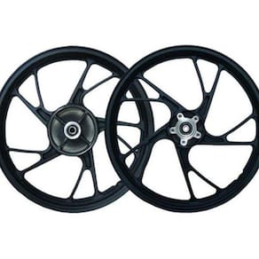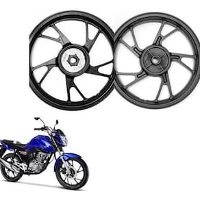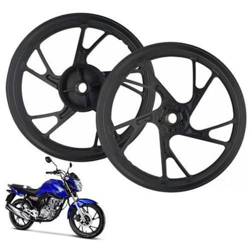 Rodas liga leve pe de galinha titan fan 150 ex 160 (par) Par de rodas liga leve honda titan 150 ex modelo original 5 palitos Medidas das rodas: dianteira 18x160 e traseira 18x185 Pode ser utilizado pneu com ou sem camara. As rodas e as outras peças que vendemos são novas e com 3 meses de garantia contra defeito de fabricação. Incluso rolamento e espaçador 1 roda dianteira + 1 roda traseira Aplicável em motos: - titan 150 - 2014 até 2016 - titan 160 - 2016 - fan 150 - 2014 até 2018 - fan 160 - 2016 até 2018 Qualidades: Rodas fabricadas com matéria prima nobre, construídas em sistema de injeção de alumínio de alta tecnologia, o que proporciona além de muita leveza, um ótimo acabamento, altíssima qualidade e resistência. Com exclusivo design, e uma embalagem inédita, as nossas rodas de liga leve chegaram para revolucionar o mercado. Garante beleza e estabilidade para sua moto.