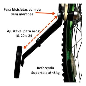 Principais destaques: - Design seguro e confiável para facilitar o aprendizado da bicicleta - Compatível com aros de 16 a 24 polegadas e bicicletas com câmbio - Composição de plástico e aço de alta qualidade para durabilidade e resistência excepcionais - Estrutura em aço reforçada para máxima estabilidade e segurança - Facilidade de regulagem e diferentes níveis de altura para uma experiência personalizada - Montagem simples e descomplicada - Suporta até 45kg, adequada para uso prolongado - Uma