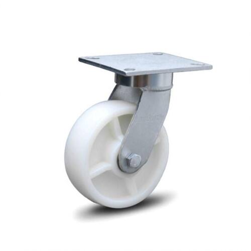 Para quem busca rodizio industrial 8 polegadas com rodas de nylon, resistente à altas cargas, impactos e trabalho com rebocador mecânico. Sua tecnologia elimina a manutenção e prolonga a vida útil do produto. Apresenta facilidade de movimentação e manobras, é resistente à corrosão e a produtos químicos O Rodizio Giratório industrial 8X2 Polegadas serie KIinpinless Colson, é indicado para diverso, industrias, pequenos pórticos, gruas e girafa, guincho hidráulico, industriais, em condições severas com tração mecânica, Em nylon 100% (poliamida 6). com duplo rolamento de esferas de precisão 6203ZZ (5 e 6), 6204ZZ (8), 6205ZZ (10) e manga de eixo 1/2". Dureza 75 Shore D (-30C a 100C). Garfo: Fabricado em aço AISI 1045, conta com uma estrutura reforçada com garfo em 6 mm de espessura e com soldas internas e externa nas pernas. Este Rodizio não tem o pino mestre central, pois, o cabeçote é usinado temperado, o que dá maior resistência e precisão. Características técnicas: Diâmetro da roda (pol): 8 Polegadas - 203,2 mm Placa giratória: 130 X 140 mm Com freio: não Largura da banda da roda : 2 polegadas 50,80 mm Raio de giro do rodízio (mm): 159 mm Altura total (mm): 251 mm Capacidade de carga (kg): 800 kg Dureza: 95 shore Material: PU - Poliuretano Temperatura de trabalho: -30 a 100 Cor: Branco