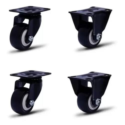 Em aço com acabamento epóxi preto resiste a corrosão, apresenta boa mobilidade, baixo ruído, maciez, conforto e não marca o piso roda com duplo rolamento de de precisão, núcleo em polipropileno branco e banda de pvc bp preta . Dureza 75 shore a -10c a 50c . Kit sendo 2 rodizios giratórios e 2 rodizios fixos, fixação placa retangular 4 furos medidas 70 x 50 mm entre furos 50 x 35 mm, altura rodízio 74 mm, capacidade carga por rodízio 50 kgs, eixo duplo rolamento de roda 2 50 mm, garantia 3 meses defeito fabricação Marca: Movifacil