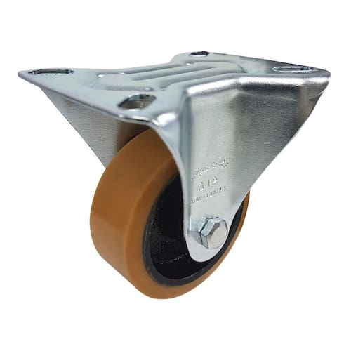 A roda é feita de poliuretano moldado, com núcleo em ferro fundido e mancal com bucha de nylon, oferecendo robustez e resistência a óleos, graxas, solventes, sais e produtos químicos.