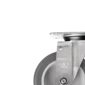 Possui o eixo da roda rebitado e proporciona rodagem macia e silenciosa, ótima proteção ao piso, excelente resistência química e boa resistência ao desgaste e aos impactos.
