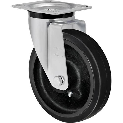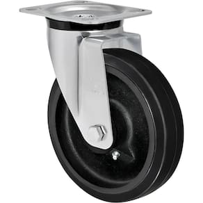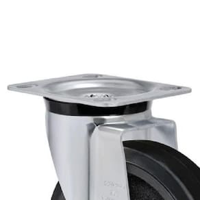 O Rodízio Giratório com Placa é produzido com revestimento de borracha moldada vulcanizada em núcleo de ferro fundido cinzento. Roda com suavidade e baixo nível de ruídos, absorvem choques e vibrações. São resistentes a abrasão e produtos químicos. Podem ser utilizadas em velocidades de até 4km/h. Possui garfo reforçado, fabricado em chapa estampada e cabeçote com dupla pista de esferas, acabamento zincado. Eixo da roda parafusado.