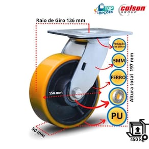 Diâmetro da roda (pol): 6 Polegadas - 152,4 mmPlaca giratória: 130 X 140 MMsem freioLargura da banda da roda : 50 mmComprimento do cubo (mm): 11 mmRaio de giro do rodízio (mm): 136mmAltura total (mm): 197 mmCapacidade de carga (kg): 450 kgDureza: 95 shoreMaterial: PU - PoliuretanoTemperatura de trabalho: -20 a 70Cor: Amareloindicado: concreto liso, asfalto, cerâmica, aço, metal, madeira, Proteção ao piso, trabalho silencioso, água, contato ocasionado com o vapor, óleo industrial, tração manual.