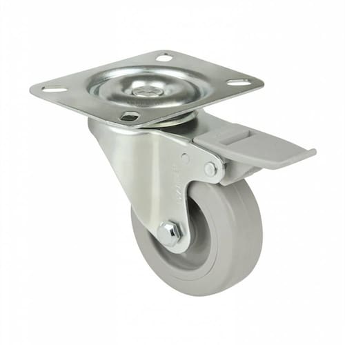 Rodizio industrial Roda da linha pesada Ø75mm Anti risco Rodizio com freio Valor da peça Diâmetro: 75mm Capacidade de Carga: 80 Kg Altura Total: 107mm Fixação: Chapa plana Sugestões de Aplicação: Mesas, armários para ferramentas, fornos, buffets, assadeiras, cozinhas industriais, carrinhos industriais, linha de refrigeração, equipamentos industriais, balcões frigoríficos, refrigeradores, expositores, gôndolas.