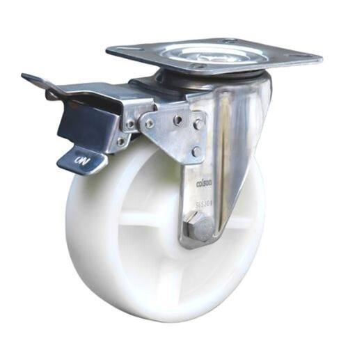 Em aço inox AISI 304 com dupla pista de esferas, pino mestre com parafuso reforçado, freio em inox.