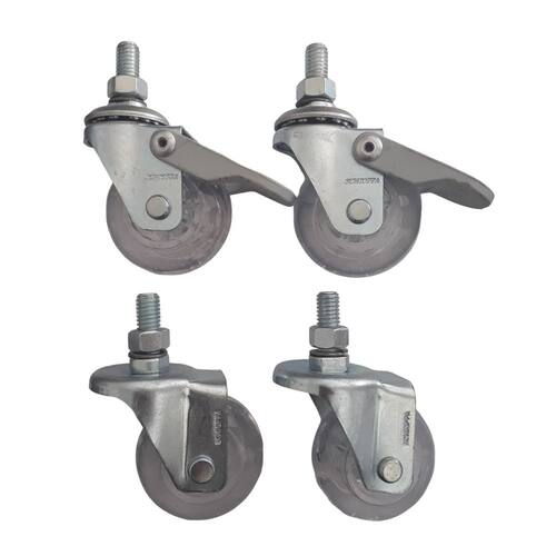 Garfo fabricado em chapa estampada e cabeçote com uma pista de , acabamento zincado. Eixo da roda rebitado, roda 75 mm colorgel, composto termoplástico com pvc transparente. Dureza 90 shore a -10ºc a +50ºc injetada com revestimento em composto termoplástico com pvc transparente em diversas cores e núcleo em acrílico. Ideal para móveis, gira com muita facilidade, requerendo pouco esforço para movimentação. Não deforma sob carga estática, apresenta boa resistência química e a impactos moderados. Produzida com material reciclável 2 rodizios giratórios com freio e 2 rodizios fixos fixação parafuso roscado 3/8 x 25 mm altura rodízio 62 mm capacidade carga por rodízio 40 kgs eixo furo passante sem rolamento freio pedal acionamento simples trava somente a roda garantia 3 meses defeito fabricação Marca: Movifacil