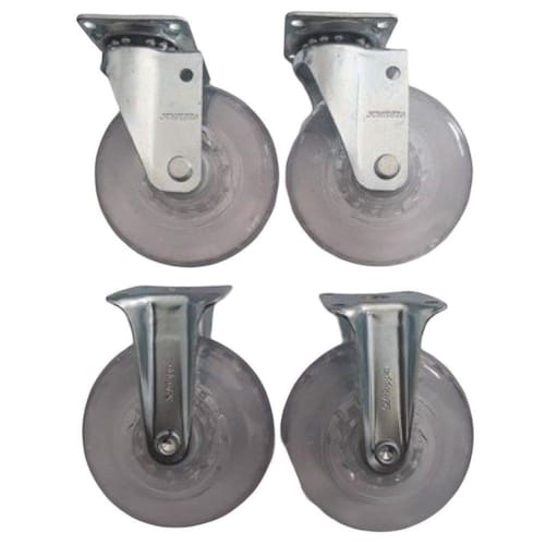 2 rodizios giratórios e 2 rodizios fixos Fixação placa quadrada 4 furos medidas 42 x 42 mm entre furos 32 x 32 mm Altura rodízio 92 mm Capacidade carga por rodízio 50 kgs Eixo furo passante sem rolamento Garantia 3 meses defeito fabricação Marca: Movifacil Ean: 7897486556434