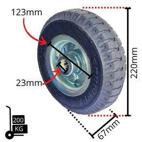 Dados técnico:com rolamento esfera eixo: 5/8 pol. ( 16 mm)Diâmetro da roda: 8,5 ( 215 mm)Largura da pneu: 58 mmModelo: 2.50-4Altura do perfil: 45 MMComprimento do cubo: 48 mmDiâmetro do cubo: 5/8 ( 16 mm)Aro da roda: chapa aço 1,5 mmPneu com câmera speed 4 lonasBase de ferro super reforçado.Capacidade de carga: 150 kg cada roda, para garantir uma boa qualidade do produto e maior dia útil é aconselhável usar uma margem de segurança de 25%Peso da roda: 1.05 KgIndicada para superfícies de trabalho: concreto liso, asfalto, cerâmica, aço/metal, madeira.,