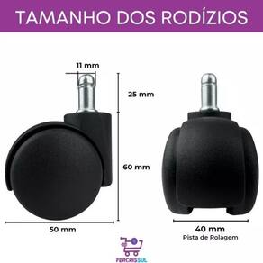 Rodízio Premium Para Cadeira - 1 Peça Rodízios para Cadeira de Escritório 1 unidade? Alta Qualidade e Durabilidade ?? Material Resistente: Fabricados em plástico e metal de alta resistência, garantindo longa vida útil.? Movimentação Suave: Rodas duplas que deslizam facilmente, evitando arranhões no chão.? Fácil Instalação: Sistema de encaixe universal para cadeiras de escritório.? Versatilidade: Ideal para cadeiras de escritório, gamer e outros móveis com rodízios.* Rodízio em Nylon 2 Polegadas 50mm para Cadeiras e Movéis em Geral* ATENÇÃO: Este pino de encaixe é padrão em aproximadamente 95% dos modelos de cadeira, todavia recomendamos remover um de seus rodízios e verificar se é este mesmo padrão de sua cadeira, de pino com diâmetro de 11mm e um anel no topo, conforme fotos do produto.CARACTERÍSTICAS DO PRODUTO- Pino removível- Diâmetro da roda: 50mm- Pino removível com 11mm de espessura e 25mm de altura- Pino com anel elástico para fixação- Composição: Corpo e Roda em Nylon, eixo e pino em Aço SAE1020.- Roda Revestida com Poliuretano, NÃO RISCA O CHÃO- Certificação ABNT NBR 13962/06- Carga por rodízio: 30kg Conteúdo da embalagem: 1 rodízios para cadeira? Tamanho do pino: Padrão universal (verifique a compatibilidade com sua cadeira)? Compre agora e renove sua cadeira com rodízios novos! Marca: EDR Import