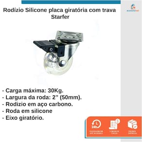 -Para Área externa e Interna. Não Arranha! -Material da Base: Aço Carbono. - Roda em Silicone -Dimensão: rodinha com 2" (50mm) de diâmetro. -Placa giratória com 4 furos para melhor fixação em objetos. -Trava para maior segurança e estabilidade dos objetos. -CAPACIDADE MÁXIMA: 30kg/rodinha.
