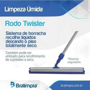 Rodo Twister 45 Cm Sem Cabo Rt450 Refil Bralimpia Informações Adicionais: Modelo: Rodo Twister Código: RODOTWISTER-001-SEMCABO - Categoria: Materiais Limpeza Cabos / Rodo / Vassouras Peso: 387 - Dimensões C x L x A : 48 x 10 x 12 Características: - Seu sistema de borracha com canto permite recolher líquidos, deixando o piso totalmente seco com menos esforço. - É o único rodo que também pode ser utilizado para recolhimento de sujidades a seco em locais como salas limpas e hospitais. - Produzido em alumínio e borracha nitrílica que permite a troca da lâmina. - Este equipamento foi projetado para espaços e lugares onde haja a necessidade de angulação do cabo; como para limpar embaixo de gôndolas e mobílias e área restritas. Especificações: - Largura: 48 cm - Altura: 12 cm - Peso: 0,380 kg - Circunferência do cabo: 1,5 cm Ean: 7898319322882