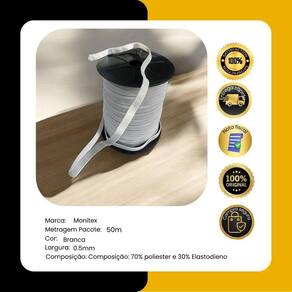 Composição: 70% poliester e 30% Elastodieno Largura: 0.5mm Metragem: 50 metros Cor: Branco Numeração:n8 CUIDADOS DE CONSERVAÇÃO