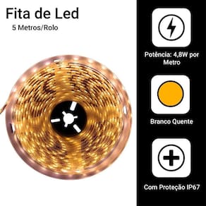 - Tensão: Fonte Bivolt (110~220v) Saida 12v - Potência: 8w por metro - Quantidade de Leds: 300 leds em 5 metros ou 60 leds por metro - Luminosidade: 720 Lúmens por metro - Vida Útil: 50.000 h - Temperatura de Trabalho: -20 a 50°C - Índice de proteção: IP65 - Cor: Branco Quente - Temperatura de Funcionamento: -20 a 50°C - Ângulo de Iluminação: 120° - Modelo SMD: 5050 - Resistência a Água: Sim - Comprimento: 5 m - Espessura: 0,25 cm - Largura: 0,9 cm - Material: Silicone