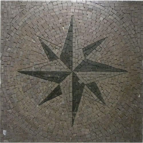 Pedras utilizadas: Rosa dos ventos executada em tons discretos de basalto com leve contraste entre as cores, sugerindo uma marca dagua no piso de quem deseja colocar sua marca de forma discreta. Os tons podem variar conforme o lote das pedras
